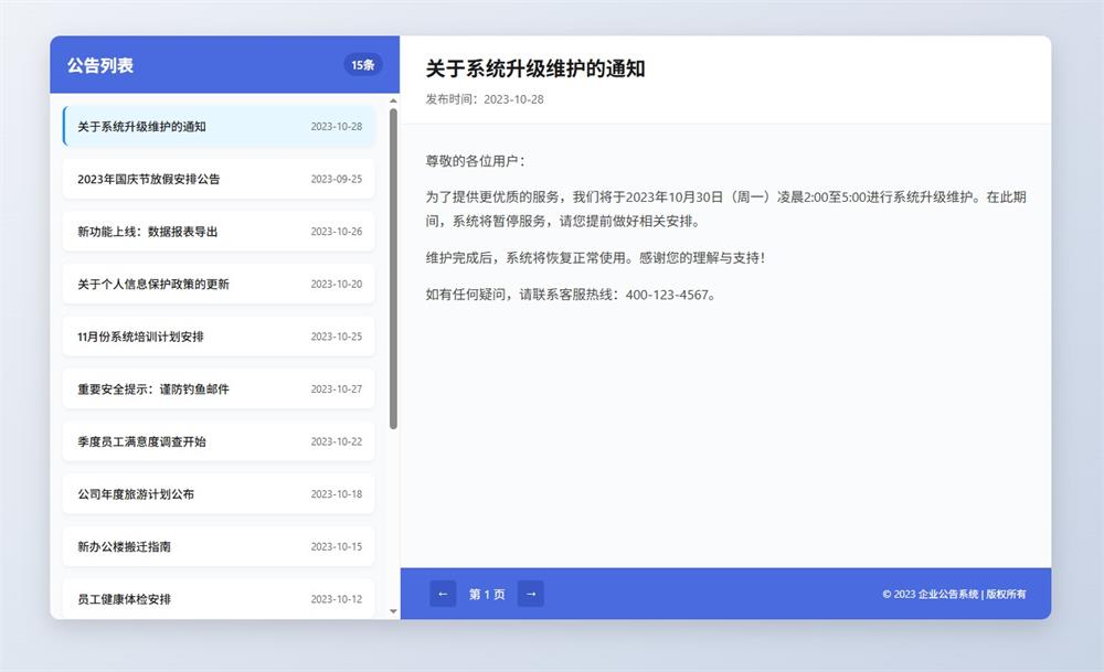 该样式采用了左右分栏的布局设计。左侧是 “公告列表”,以列表形式呈现多条公告条目,包含公告标题与发布时间,方便用户快速浏览和查找不同公告;右侧则是选中公告的详细内容展示区域,清晰呈现公告的具体信息,整体布局简洁明了,层次分明,能让用户高效获取公告相关内容。
