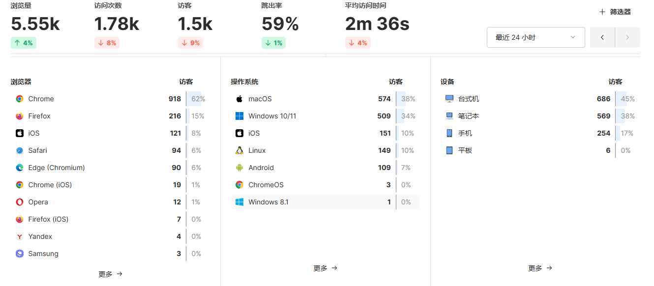 统计功能基本的都有,和国内的百度统计相比少了搜索关键词的展示。作为一款轻量使用的统计来说足够了。